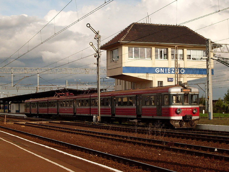 28.08.2010 EN57-634 pod koniec pięknego, słonecznego dnia odjeżdża ze stacji w Gnieźnie z poc. rel. Gniezno - Jarocin.