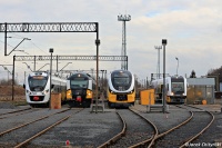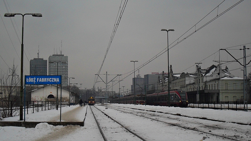 05/01/2011/ ŁÓD¬ - Widok na stację Łódź Fabrycza: po prawej widoczny budynek dworca kolejowego, hotel centrum, budynek regionalnego oddziału TVP, łódzki dom kultury oraz 2 biurowce. Przy peronach stoi m.in. kibel EN57-041ra do Skierniewic (włączone światła) oraz ED74-004a do Warszawy Wschodniej.