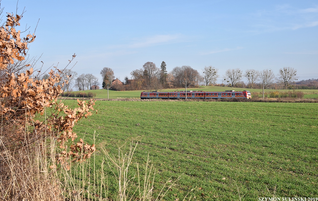 Zmodernizowana jednostka elektryczna EN57ALd-2223 należąca do Oddziału Warmińsko - Mazurskiego Przewozów Regionalnych w Olsztynie opuściła przystanek osobowy Nowa Wieś Cierpkie i rozpoczyna pokonywanie trudnego i pięknego kawałka szlaku Pasłęk - Małdyty, pociąg REGIO 90719/8 relacji Elbląg - Gutkowo (do Olsztyna Głównego komunikacja zastępcza).