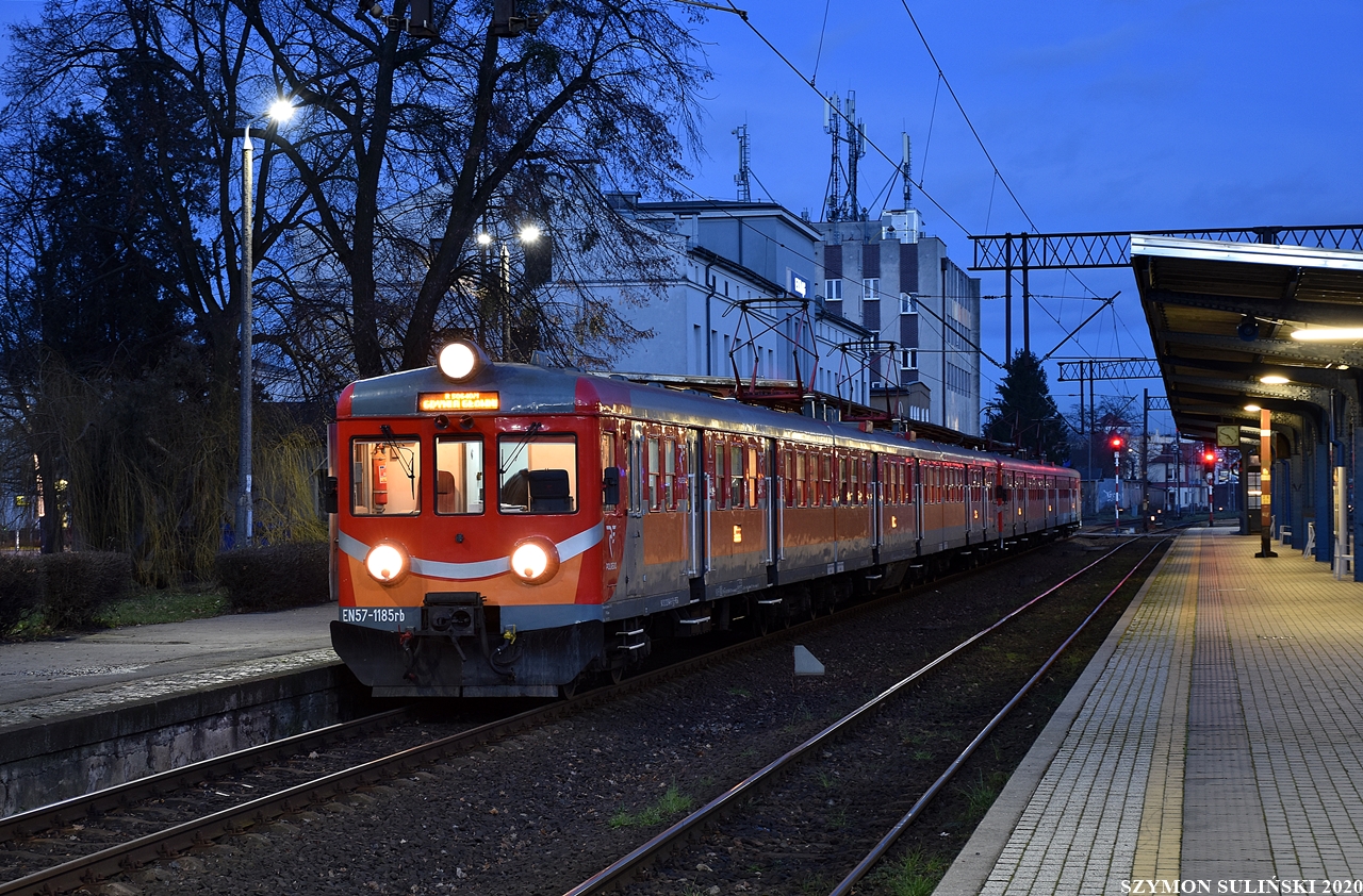 Klasyczne jednostki elektryczne EN57-1185 i 1395 należące do Pomorskiego Oddziału POLREGIO w Gdyni oczekują na odjazd z toru 6 stacji Elbląg, pociąg REGIO 50640 relacji Elbląg - Gdynia Główna. Po zakupie przez Województwo Pomorskie 10 Impulsów klasyczne ezt mają znacznie mniej pracy. Do Elbląga planowo obsługują już tylko 1 parę pociągów, a na tym obiegu pojawiły się w zastępstwie Impulsa.