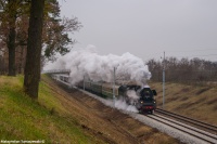 Projekt Turkola na Pomorzu Zachodnim. Pociąg specjalny ze Złocieńca do Kołobrzegu prowadzony parowozem Ol49-69 odjeżdża z Drawska Pomorskiego w kierunku Runowa Pomorskiego.