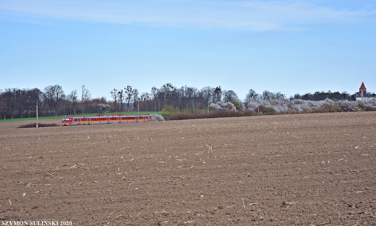 Klasyczny ezt EN57-1950 należący do Zakładu Warmińsko - Mazurskiego POLREGIO zostawia za sobą Pasłęk, pociąg REGIO 90705 relacji Gutkowo - Elbląg (Olsztyn Główny - Gutkowo komunikacja zastępcza).