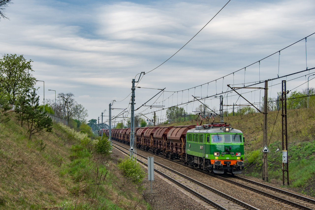 Zielona EU07-128 wraz ze składem brązowych wagonów serii Tads wyjechała ze stacji Bydgoszcz Wschód Towarowa i udaje się w kierunku południowym. Docelową stacją są Mościce Azoty.