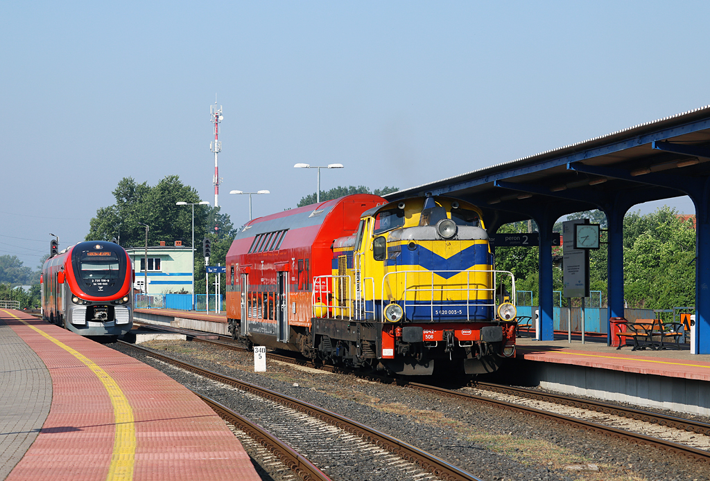 SU42-506 chwilę po oblocie widocznego bohuna PolRegio z którym przyjechał przed paroma minutami jako 88211 z Gorzowa Wielkopolskiego manewruje po torze 1 celem podstawienia się pod budynek stacyjny na tor 2. Na tym torze odjazdu oczekuje SA139-023 (odjeździe za chwilę jako 88214 do Gorzowa Wielkopolskiego.