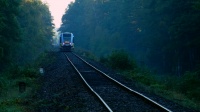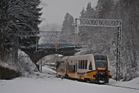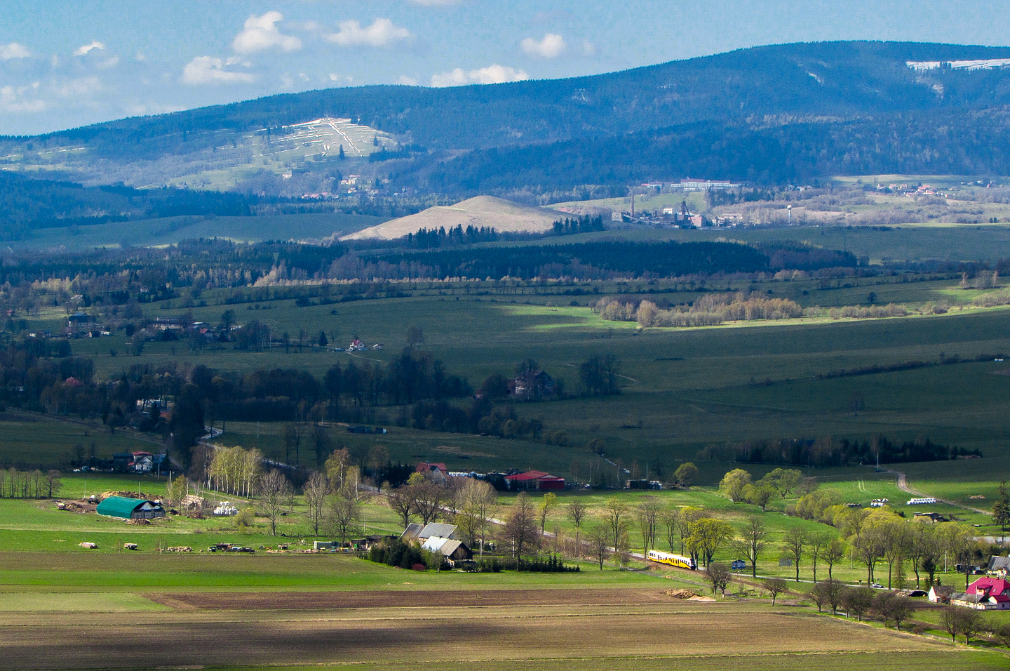 Błyszczący w porannych promieniach wiosennego słońca SA134-004 Kolei Dolnośląskich jako pociąg z Trutnova do Jeleniej Góry pędzi w kierunku przystanku kolejowego w Lubawce. Oprócz widoku na kawałek zabudowań Lubawki, możemy tu podziwiać rozległy krajobraz Bramy Lubawskiej, w którym już niedługo pojawi się droga ekspresowa S3. Widać też tytułową hałdę w Lamperticach, którą oświetla słońce i leżące tuż obok niej zabudowania dawnej kopalni węgla, zaś na ostatnim planie możemy podziwiać fragment wschodnich Karkonoszy i stoki narciarskie mieszczące się w Prkenným Dole, który jest dzielnicą miasta Žacléře.
