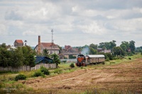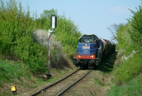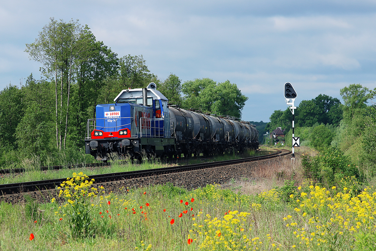 Kiosk Lotosu 6Dg-147 z wyjątkowo długim składem cystern do przewozu płynnej siarki rel. Kostrzyn KoA - Wierzbno uchwycony chwilę po minięciu widocznego w oddali p.o Dąbroszyn pędzi na Gorzów.