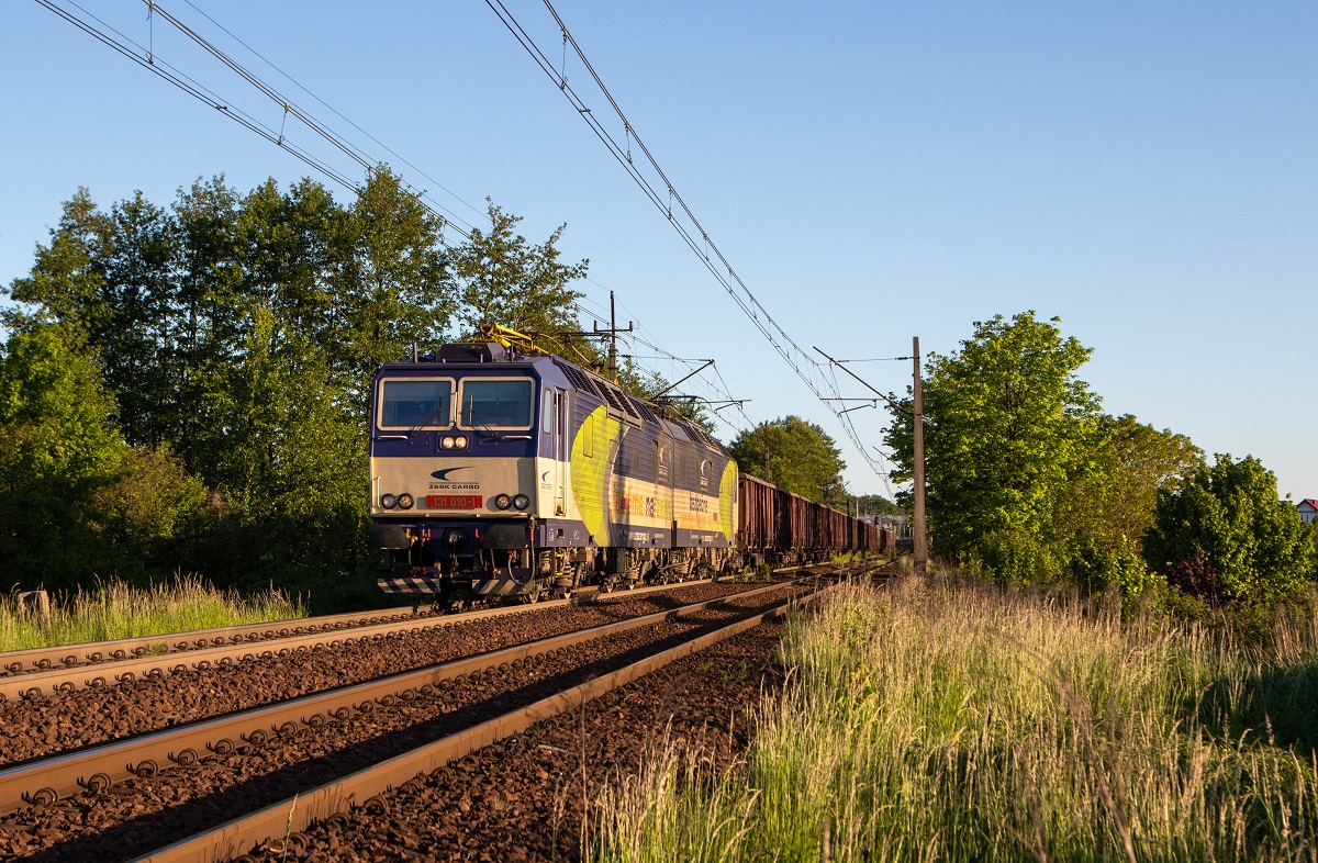 131-010 ZSSK Cargo ze składem węglarek relacji Dąbrowa Górnicza Towarowa - Świnoujście SiA mija Goleniów w przyjemnym, wieczornym świetle. Krajobraz o tej porze roku jest już w zasadzie typowo letni. Wraz z początkiem czerwca rozpoczął się też okres uznawany za lato klimatyczne.