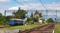 Lokomotywa ST44-1214 dostarczyła pierwszą część węglarek na bocznicę w Wojcieszowie, teraz wraca do Marciszowa po drugą część składu. W tle widać Rezerwat Przyrody Góra Miłek.