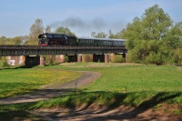 Jaworzyńska TKt48-18 z 3-wagonowym pociągiem retro "św. Piotr i Paweł" relacji Jaworzyna Śląska - Strzegom - Grabina pokonuje niedawno wyremontowaną miejską estakadę w Strzegomiu, mijając bodaj najbardziej charakterystyczny zabytek tej miejscowości, a mianowicie bazylikę pod wezwaniem patronów wspomnianych w nazwie pociągu specjalnego. Podobno był to pierwszy przejazd pociągu z pasażerami po remoncie.