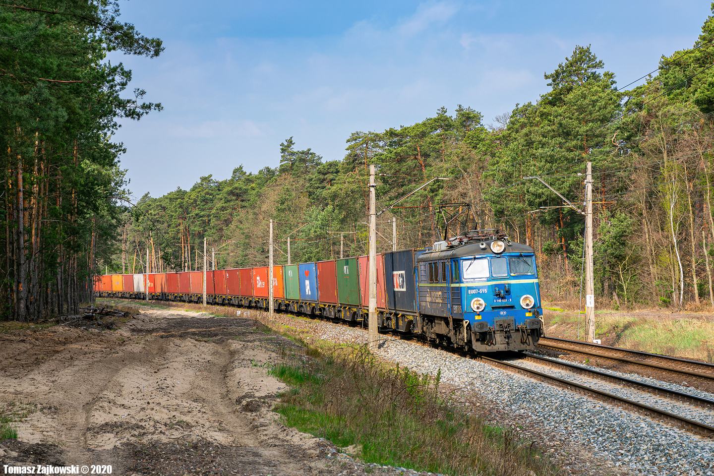 EU07-515 na czele kontenerowca do Małaszewicz przejeżdża przez Bolimowski Park Krajobrazowy szlakiem Skierniewice - Puszcza Mariańska. Zostało raptem kilka 303E z fabrycznymi reflektorami, ta widoczna na zdjęciu jest już odstawiona.