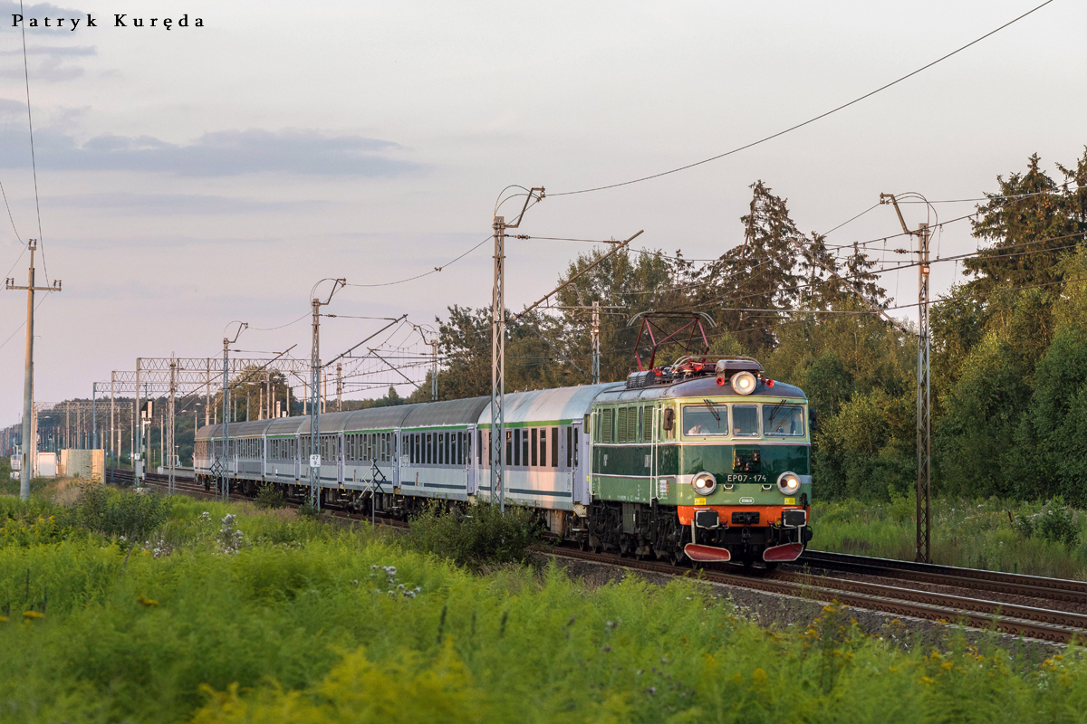Kolejny z upalnych dni i kolejny raz nudziłem się w domu, więc postanowiłem wybrać się na powrotną Hańczę, na czele której miała się pojawić będąca niespełna miesiąc po naprawie rewizyjnej EP07-174. Słońce chyliło się już ku zachodowi, jednak ostatnie promienie delikatnie oświetliły ową maszynę mijającą p.o. Szewnica. Skład zbliża się do Tłuszcza, gdzie zamelduje się równo o godzinie 19:50.