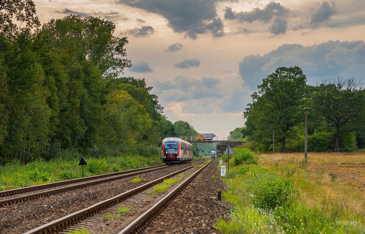 Pociąg do kultury relacji Berlin - Wrocław 642 034 i 642-543 mija wiadukt w Sieniawie Żarskiej. Opózniony jakieś 15 minut, tyle czekał na wolny tor SA105-105 do Forstu. W tym samym momencie przez wiadukt przejeżdza pomarańczowa kaczka z plandeką.