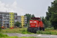 Lokomotywa DE6400-6501 "Kasia" należąca do DB Schenker Rail Polska prowadzi pociąg kontenerowy nr 774035 z Szamotuł.