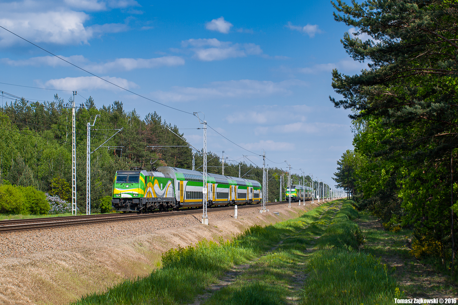 Pociąg osobowy z Warszawy Zachodniej (peron 8) do Działdowa, przed chwilą minął się z identycznym jadącym w relacji przeciwnej. Zdjęcie zrobione na szlaku Chotomów - Nowy Dwór Mazowiecki.