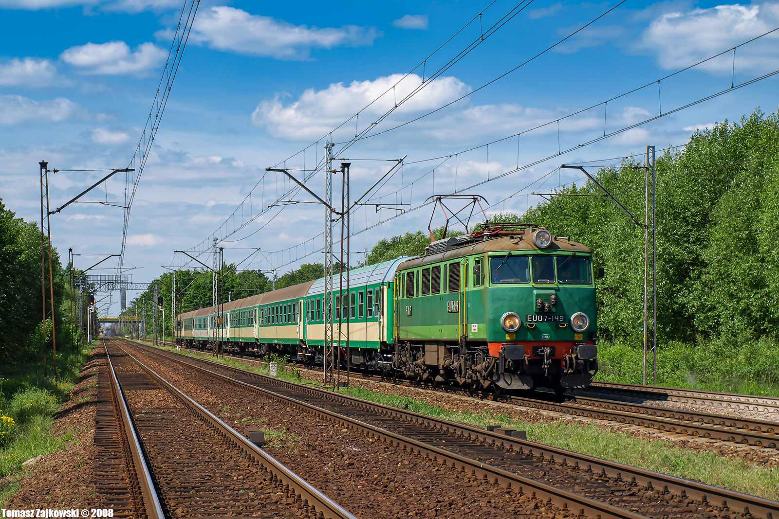 EU07-149 na czele pociągu pośpiesznego "Ostrowianin" z Ostrowa Wielkopolskiego do Warszawy Wschodniej, mknie szlakiem Grodzisk Mazowiecki - Pruszków. Bardziej zielono już się nie dało. :) Warto dodać, że lokomotywa została zmodernizowana w 2011 roku i obecnie jej numer to EU07-1522.