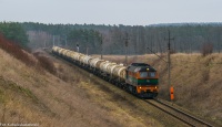M62Y-375A z próżnym wahadłem do Wapienna mija tarczę ostrzegawczą widocznego w tle semafora wjazdowego stacji Pakość.