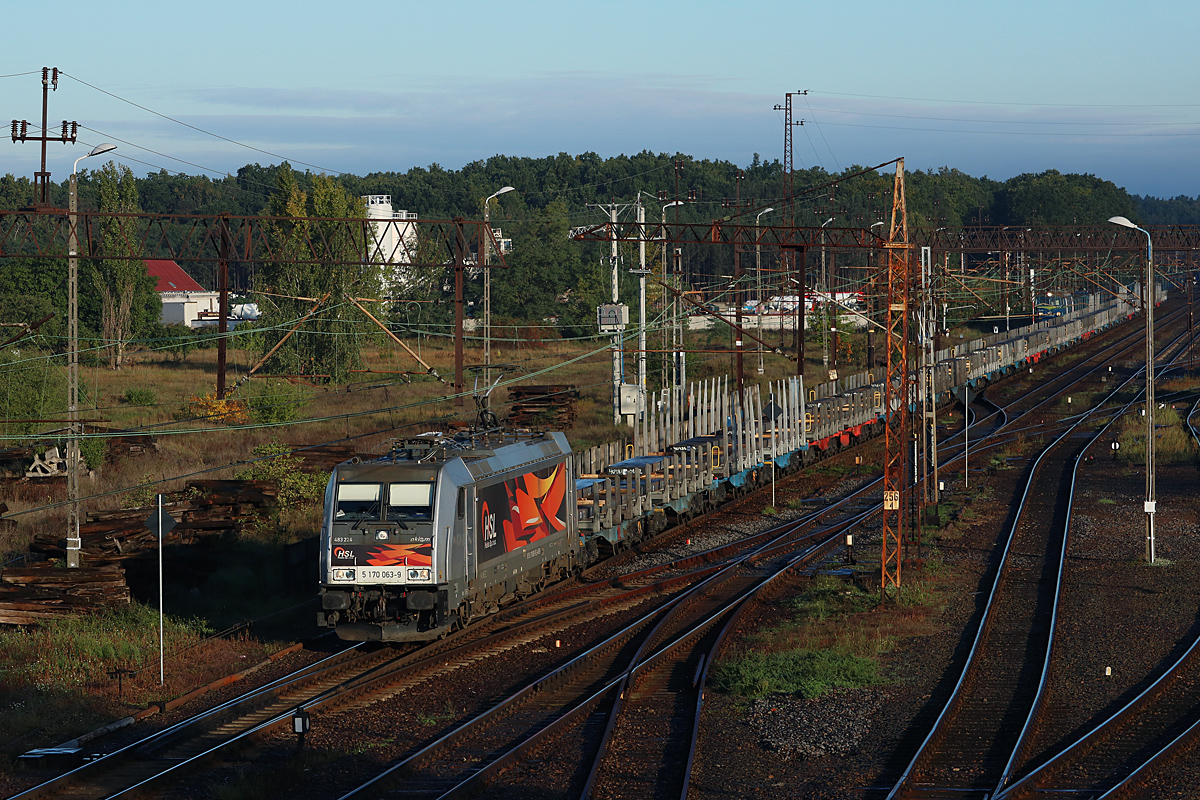 Traxx 483 224 w okleinie HSL Polska będący na wypożyczeniu w CD Cargo Poland prowadzący ładowny skład platform załadowanych sztabami jadący jako poc rel.Szczecin Port Centralny-Chałupki przejeżdża na biegu w blasku porannego wschodzącego słońca przez kostrzyńską grupę towarową Kostrzyn KoB. Była to jego jedna z pierwszych służb u nowego najemcy..