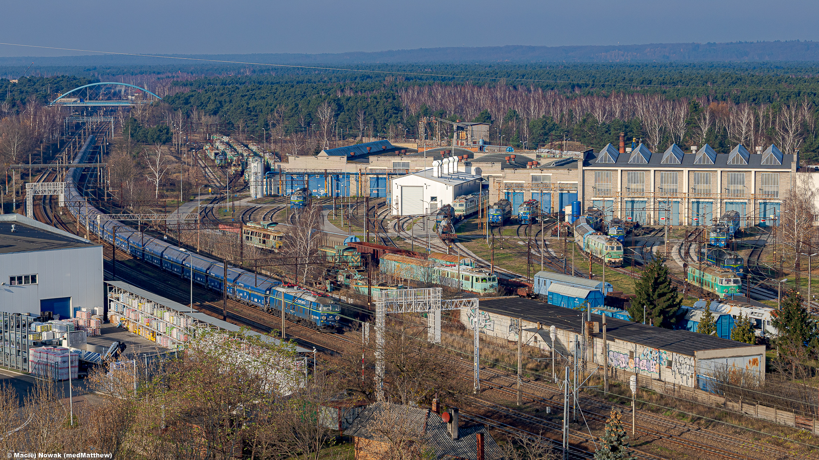 Lokomotywownia PKP Cargo w Bydgoszczy w całej swojej okazałości, a przed nią podążający węglówką towarowy, ciągnięty przez ET22-1093.