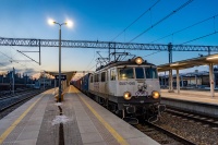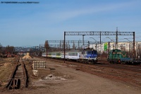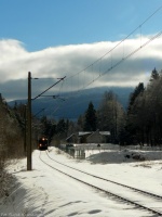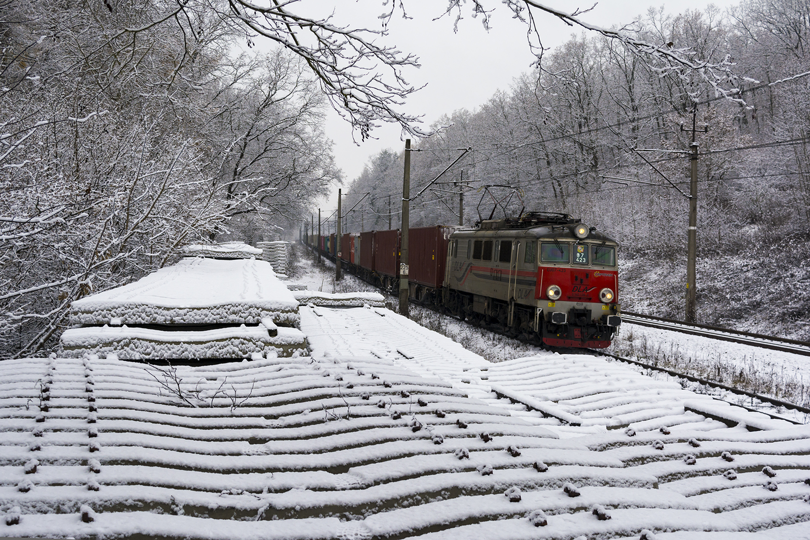 Kontenerowiec do Kolbuszowej mija zalegające od zeszłego roku podkłady, przygotowane pod remont toru, na którym znajduje się pociąg. Oprócz moich śladów, tropy na śniegu zdradziły też obecność saren, wspinających się na betonowe stosy ;-)