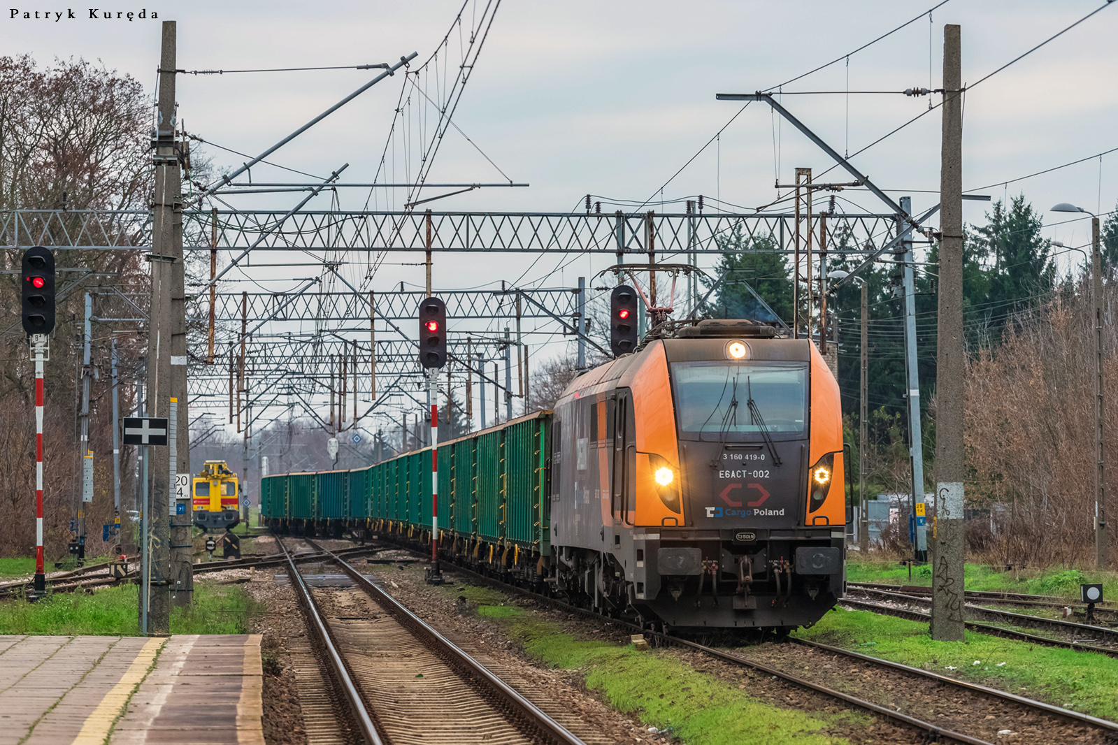 E6ACT-002 ze składem relacji KWK Piast-Ostrołęka wjeżdża na tor nr 2 w Wyszkowie, by po przepuszczeniu kilku osobówek ruszyć dalej do celu.