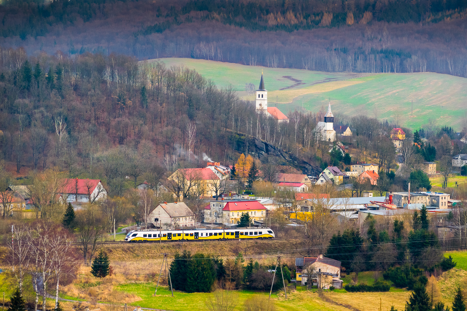 36WEa-013 jako przyspieszony pociąg osobowy OsP. Szklarka relacji Szklarska Poręba Górna- Wrocław Główny jedzie szlakiem Marciszów- Sędzisław, mijając zabudowania miejsowości Marciszów. W tle widać Kościół Rzymskokatolicki Pw. św. Katarzyny oraz Kośció Niepokalanego Serca NMP. Ilekroć jechałem odcinkiem linii 274 z Wałbrzycha Głównego do Jeleniej Góry zawsze zachwycałem się widokami, które można zobaczyć z tej sudeckiej trasy.