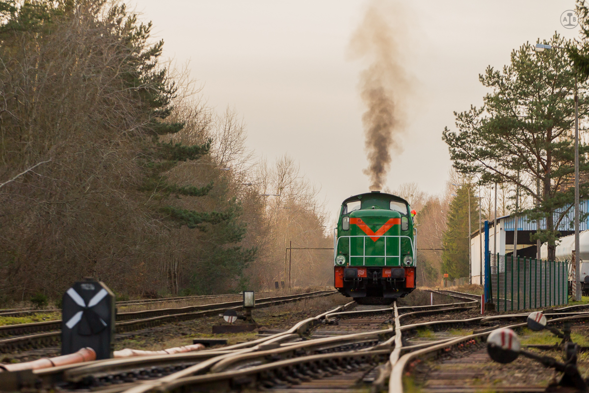 SM42-2537 manewruje z gruszkami na bocznicy pod macierzystym zakładem przy zachodzie słońca w jeden z najkrótszych dni w roku.