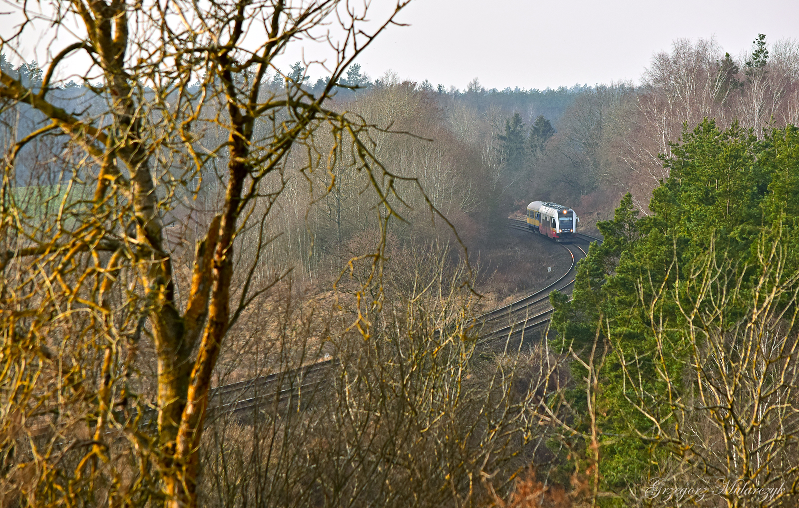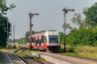 SA133-004 z jednym wagonem zbliża się do stacji w Starogardzie Gdańskim, jako pociąg w relacji Chojnice - Tczew. Zestaw zbliżą się do ciekawego miejsca, tzw. dreimostu na rzece Wierzycy. Nazwa wzięła się pewnie od trzech łuków tego mostu. Trudno z nim odstrzelić cokolwiek innego niż luzaka z uwagi na zakrzaczenie, a raczej zadrzewienie wokół obiektu. Ogólnie to ciekawa okolica, z wieloma możliwościami podejścia do tematu pociągu. Tu akurat widok z góry, zza Wierzycy i mostu, za którym znajduje się wzniesienie.