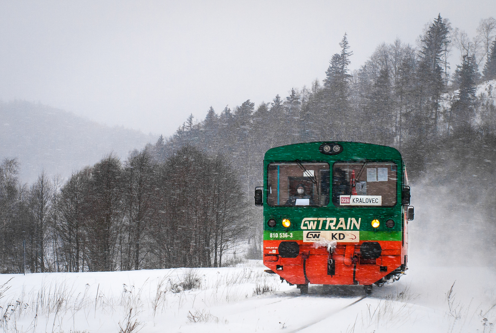 Motoraczek jeżdżący w służbie spółek Koleje Dolnośląskie i GW Train Regio z popołudniowym kursem z Sędzisławia do Královca zasuwa przez meandry linii 299 w trakcie śnieżnej zadymy. Skład zmierza w kierunku Lubawki zostawiając za sobą kłęby sypkiego śniegu. Tło zdjęcia wypełnia widoczny po prawej stronie fragment masywu Skowrońca (581 m n.p.m.). i kawałek Zadziernej (724 m n.p.m.) majaczący w oddali.