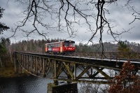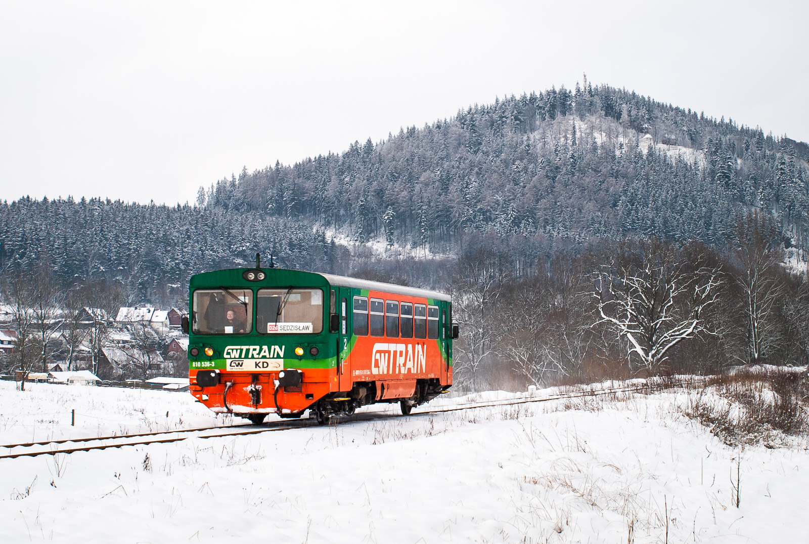 Motoraczek jeżdżący w służbie spółek Koleje Dolnośląskie i GW Train Regio relacji Královec - Sędzisław wyjeżdża z Lubawki w zimowe popołudnie. Tło zdjęcia wypełnia częściowo widoczna Święta Góra (701 m n.p.m.), która jest jednym ze szczytów Gór Kruczych (cz. Vranà Hory), jakie otulają Lubawkę.