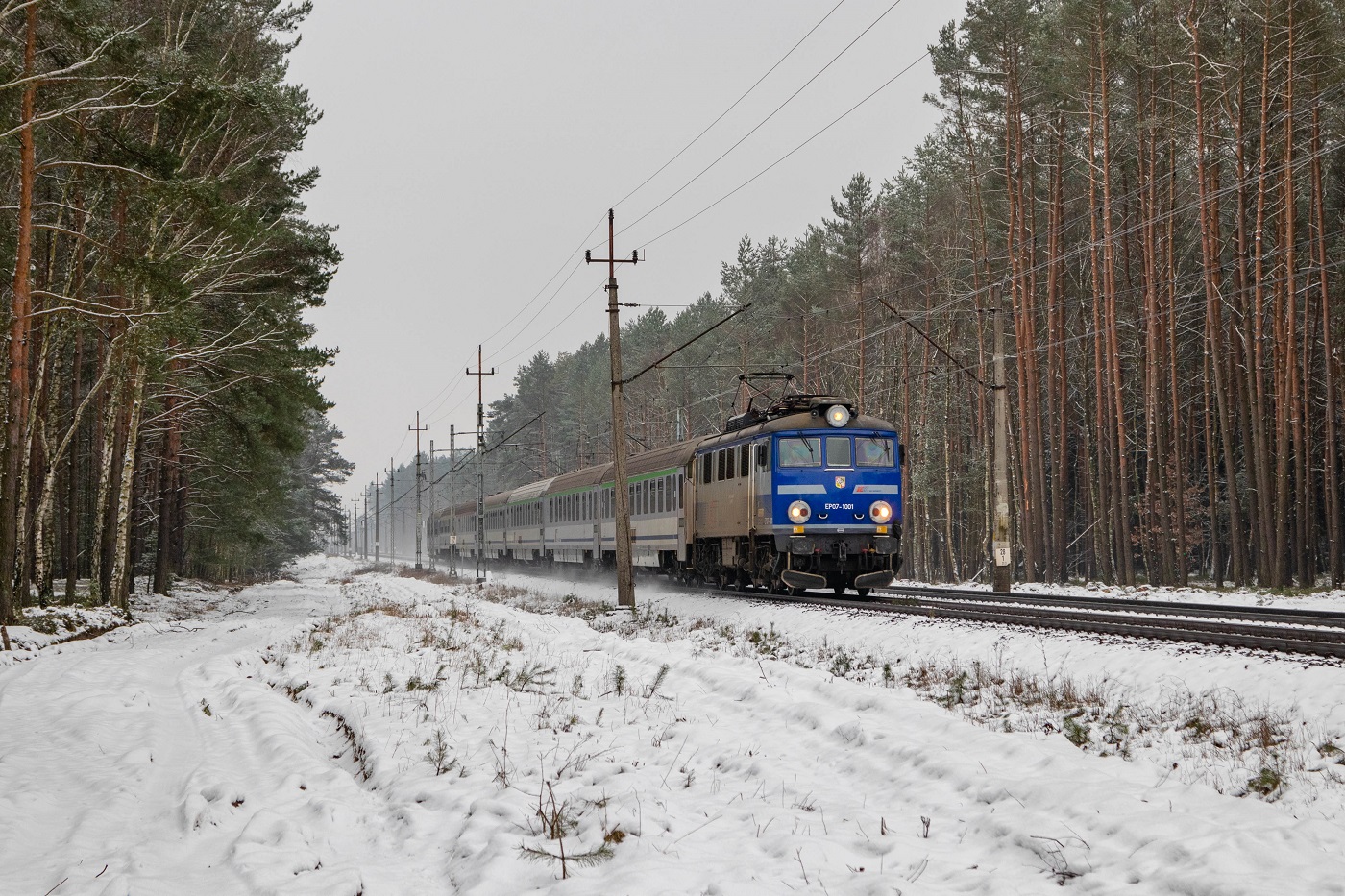 EP07-1001 z IC 38172 "Przemyślanin" relacji Przemyśl Główny - Świnoujście jedzie pięknie zaśnieżonym szlakiem Goleniów - Białuń. Ruch towarowy tego dnia nie dopisywał, więc w tych magicznych warunkach trzeba było zadowolić się pociągiem pasażerskim.