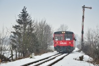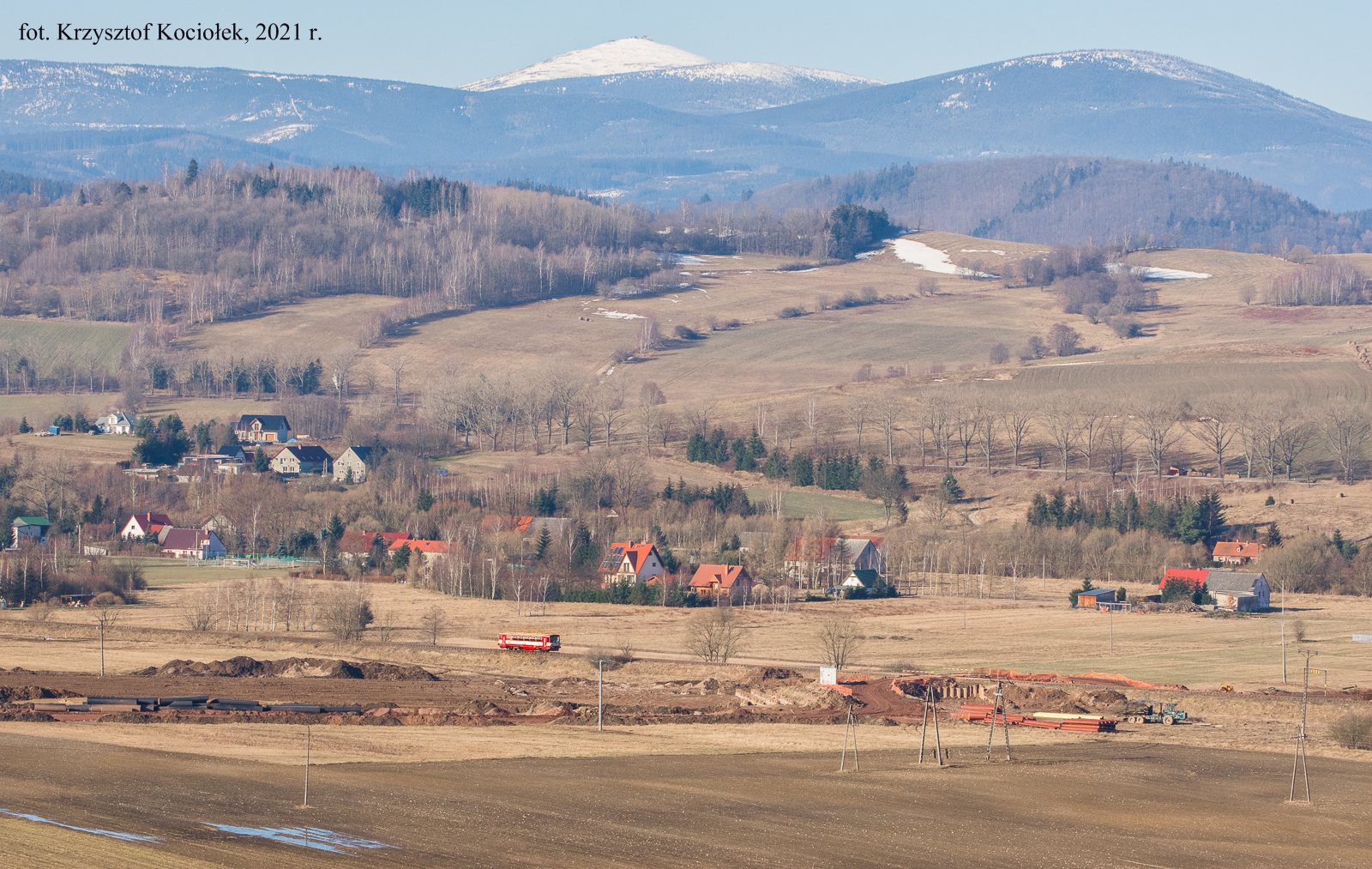 Genialny widoczek. Czerwonego motoraczka nie trudno znaleźć w późnozimowym krajobrazie na przełomie wiosny. Wiadomo jak często kursuje klasyczny motorak do Kamiennej Góry?