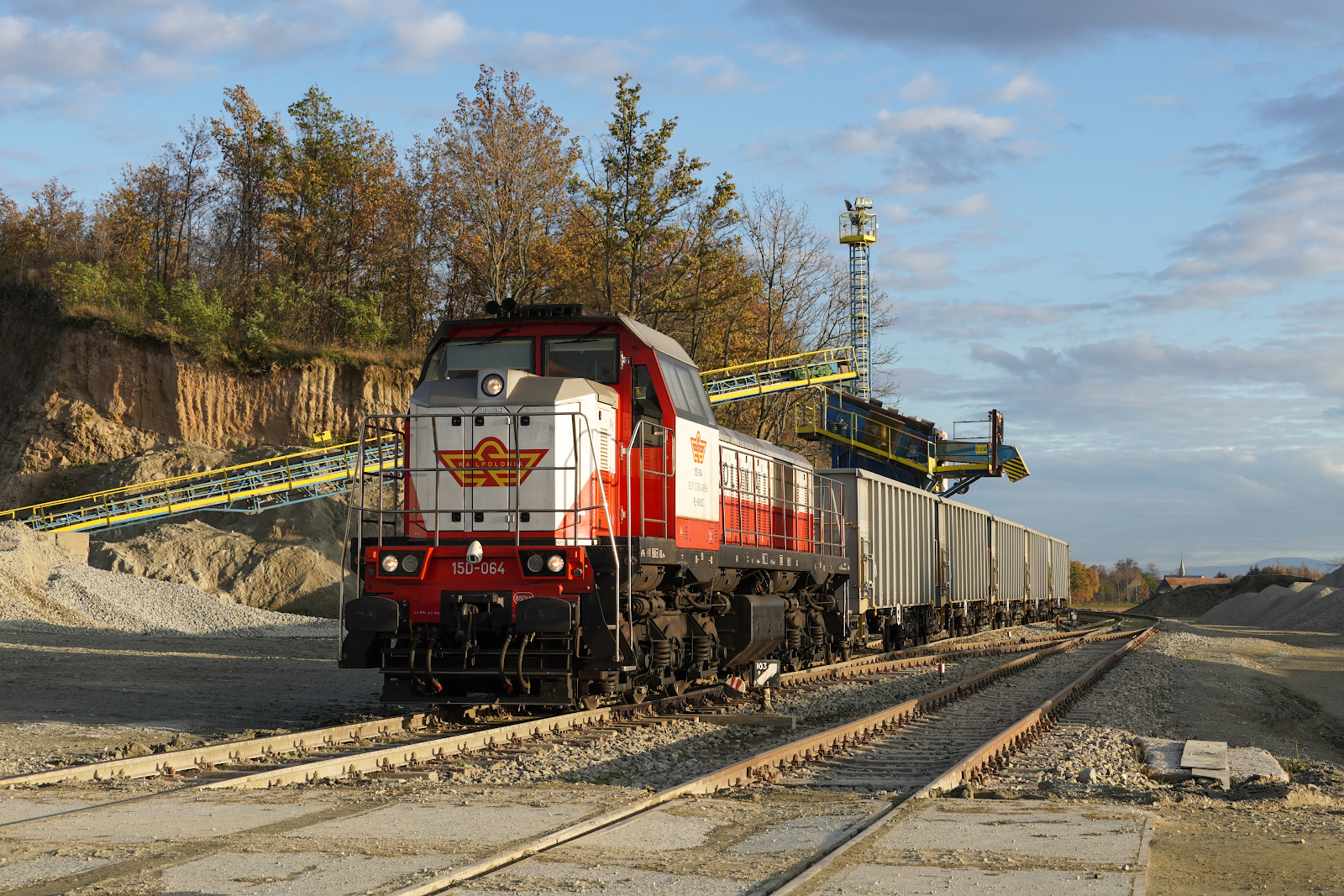 Lokomotywa 15D-064 podczas załadunku kruszywa na bocznicy Kopalni Gnejsu Pomianów-Doboszowice.