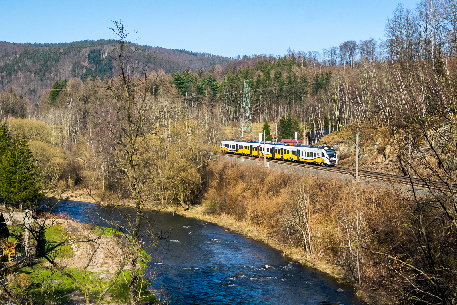 31WE-020 jako pociąg osobowy relacji Jelenia Góra Zachodnia- Wrocławia Główny opuścił stację w Janowicach Wielkich i jedzie szlakiem wzdłuż rzeki Bóbr, w stronę Marciszowa. Jest to jeden z najpiękniejszych odcinków linii 274 a także myślę że mój ulubiony szlak. Szczególnie jesienią podróż do Jeleniej Góry lub Szklarskiej Poręby dostarcza nieprzeciętnych widoków.