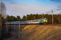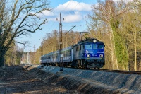 Czekoladowa Siódemka w służbie Pol Miedź Transu z Dolnośląskich Linii Autobusowych z pociągiem towarowym nr 664021 rel. Lubin KGHM - Wróblin Głogowski w żółwim tempie wjeżdża pod wzniesienie w okolicach lubińskiego lotniska jadąc w deszczowe popołudnie szlakiem Lubin - Koźlice w stronę Rudnej Gwizdanów.