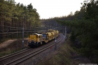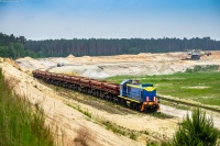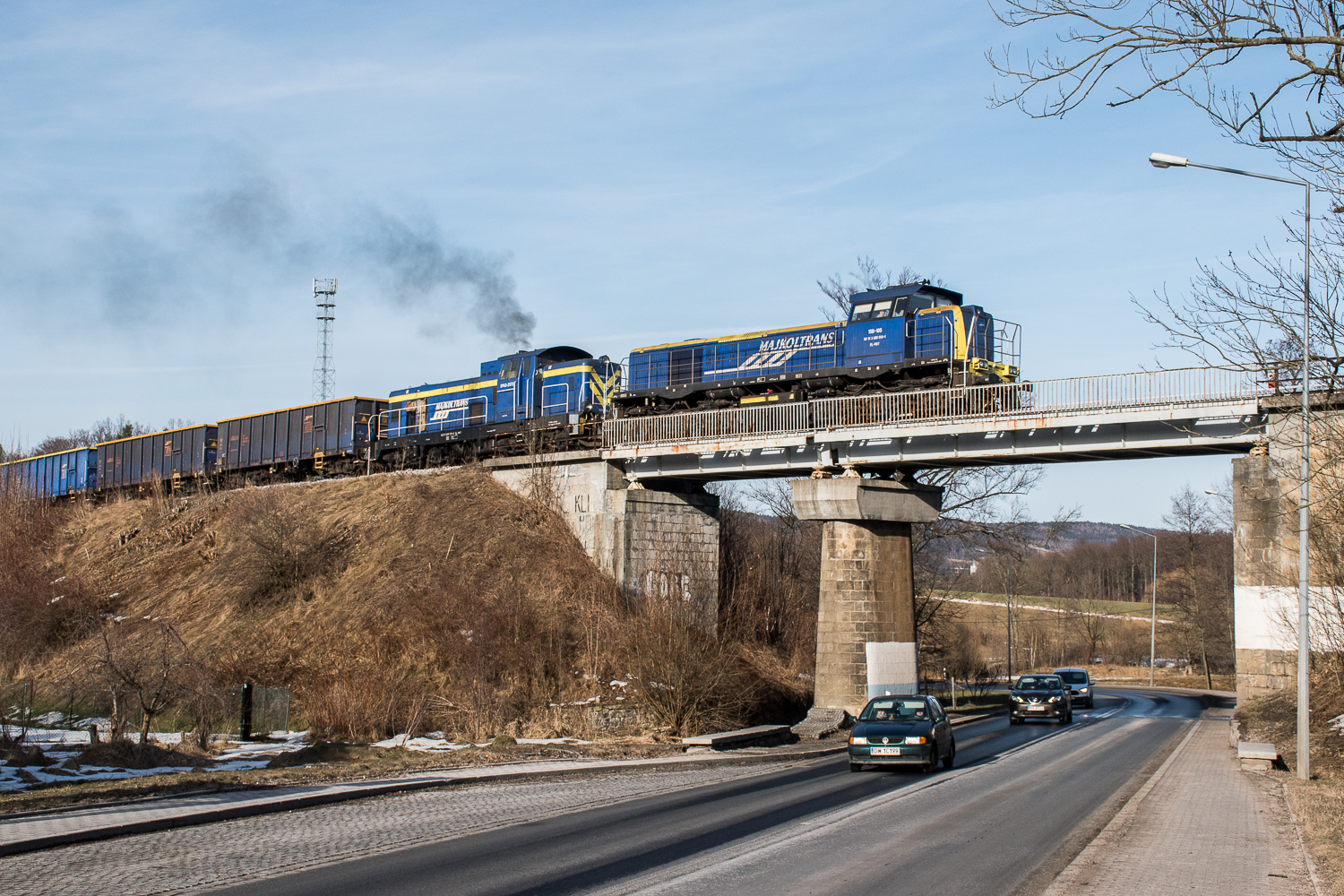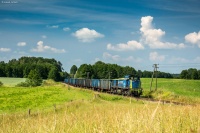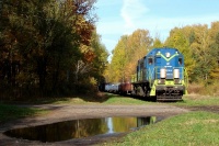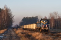 Duet spalinówek Majkoltrans ciągnie 2 część wagonów z urobkiem z Wojcieszowa do Marciszowa, gdzie połączy wagony w jeden skład i pojedzie gdzieś w Polskę. Skład złapany zupełnie przypadkiem, więc miałem sporo szczęścia. Łącznica kolejowa nr 776, na której znajduję się pociąg jest częścią byłej linii kolejowej Marciszów - Jerzmanice Zdrój. Lokomotywy na zdjęciu to 15D-105 oraz SM42-2572