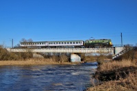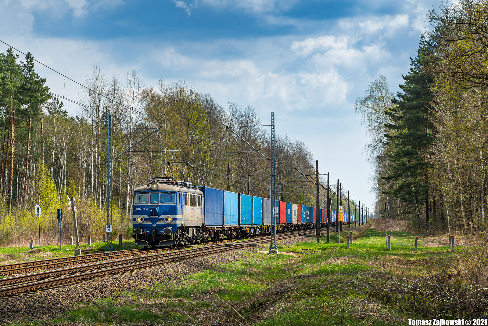 EU07-088 z esełkowym standardem, czyli kontenerami wschód-zachód, za chwilę minie nieczynny przystanem Prażmów i uda się w kierunku Tarczyna.