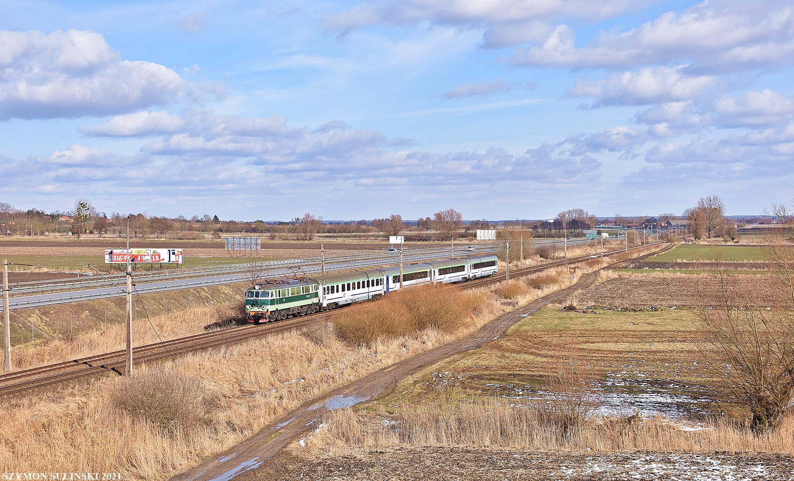 EP07-174 w historycznym malowaniu należąca do Północnego Zakładu PKP Intercity w Gdyni przemierza szlak Bogaczewo - Elbląg zbliżając się do przystanku osobowego Komorowo Żuławskie z pociągiem IC 58106 Gryf relacji Olsztyn Główny - Szczecin Główny. Piękne jest malowanie tej maszyny.