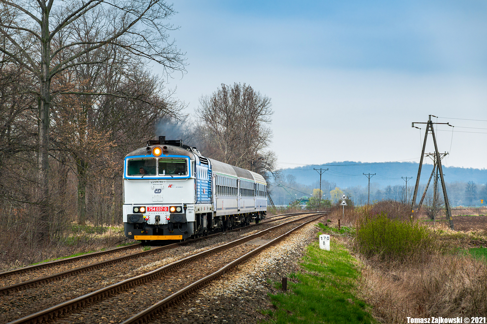 754.037-0 na czele pociągu TLK 63102 "Sudety" z Jeleniej Góry do Krakowa Głównego, przemierza szlak Kamieniec Ząbkowicki - Paczków.