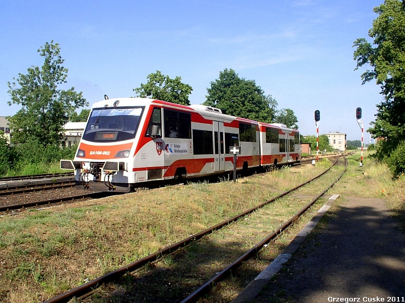 Szynobus Kolei Wielkopolskich (okropne logo) jako pociÄ…g 76533 z Ostrowa do Leszna opuszcza stacjÄ™ w Poniecu. (04.06.2011)