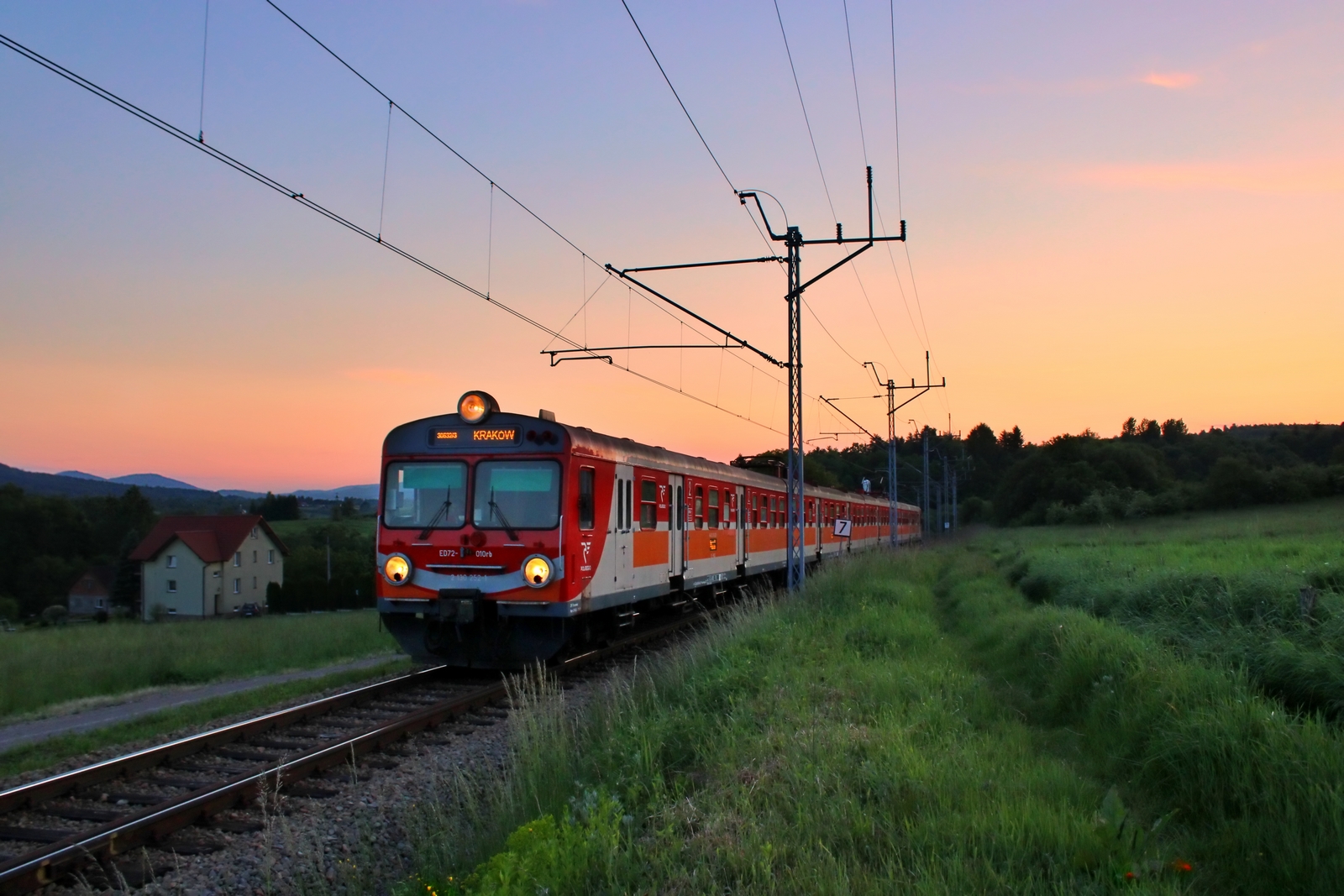 W blasku zachodzącego słońca jedzie ED72-010 jako ostatni pociąg dzienny Rysy z Zakopanego do Krakowa Głównego. Jak dobrze poczuć to, że po 20 można na spokojnie zrobić zdjęcie bez konieczności naświetlania...