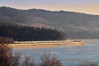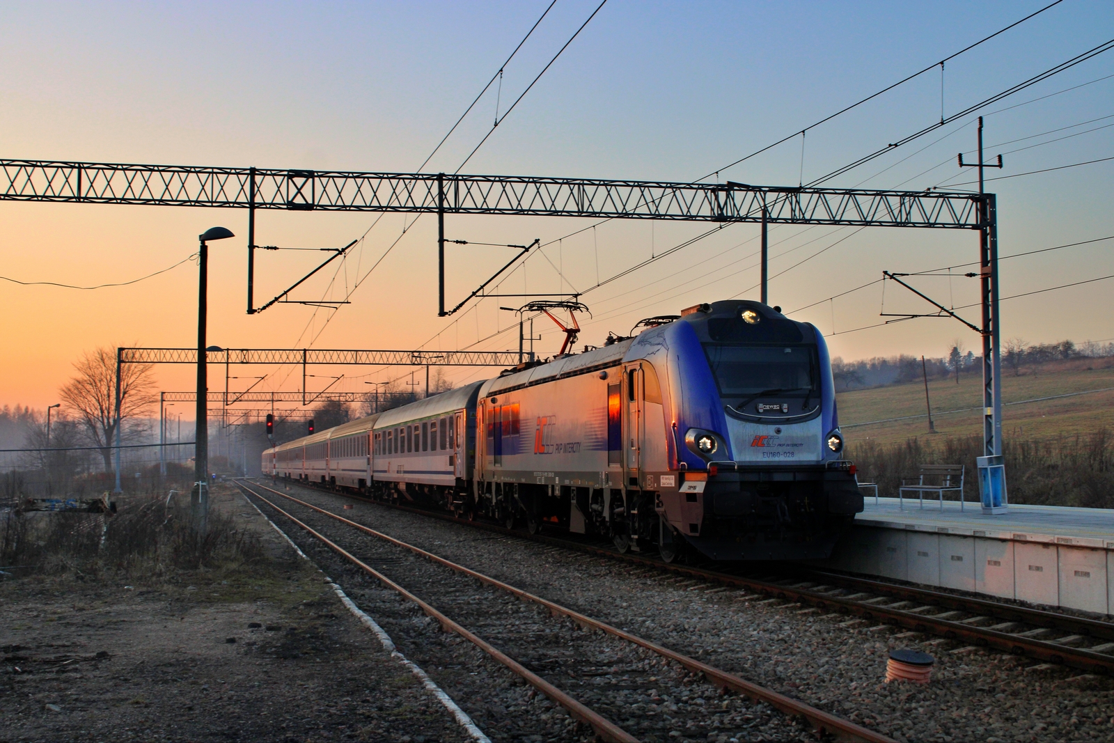 W blasku zachodzącego słońca, perony stacji Stronie mija EU160-028 z Expressem 3140/1 Tatry z Zakopanego do Warszawy.