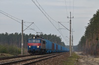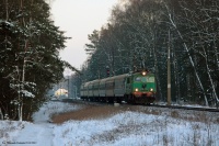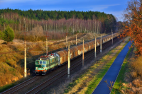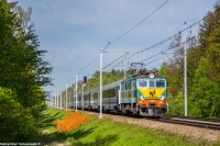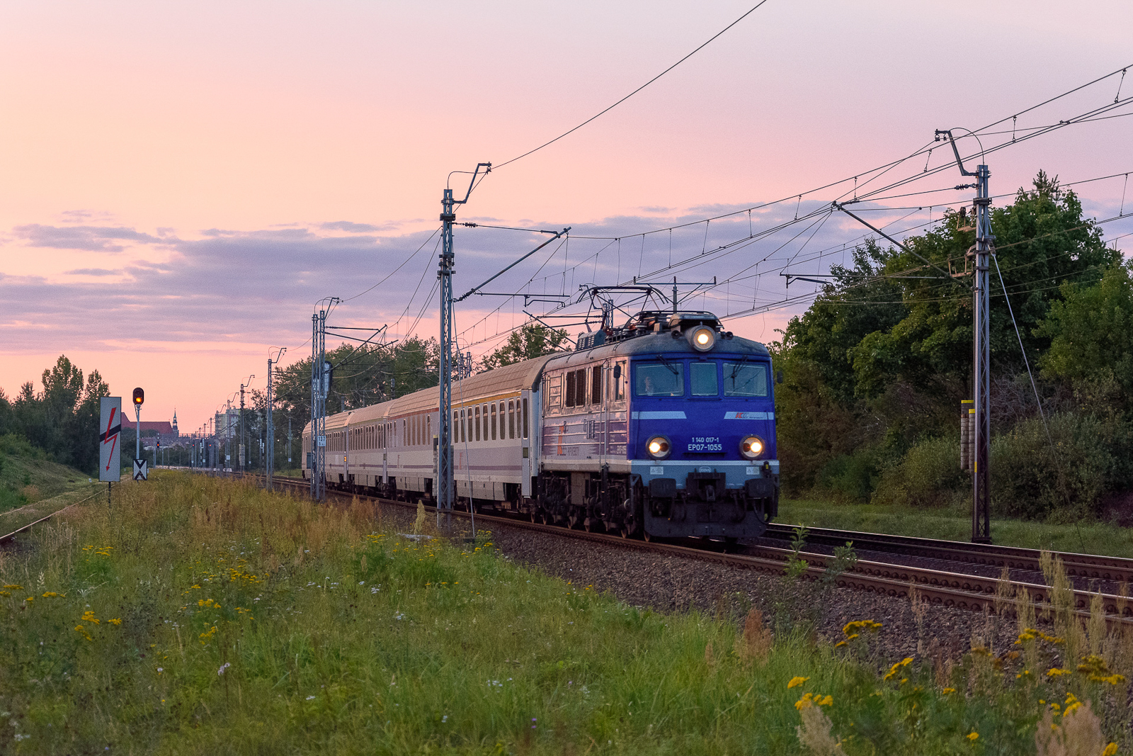Siódemka z pociągiem IC 84100 Barnim rel. Szczecin Główny - Katowice opuściła przed momentem po krótkim postoju brzeską stację jadąc w świetle zachodzącego słońca szlakiem Brzeg - Lewin Brzeski w stronę Opola. Po lewej linia kolejowa nr 288 z Nysy do Brzegu.