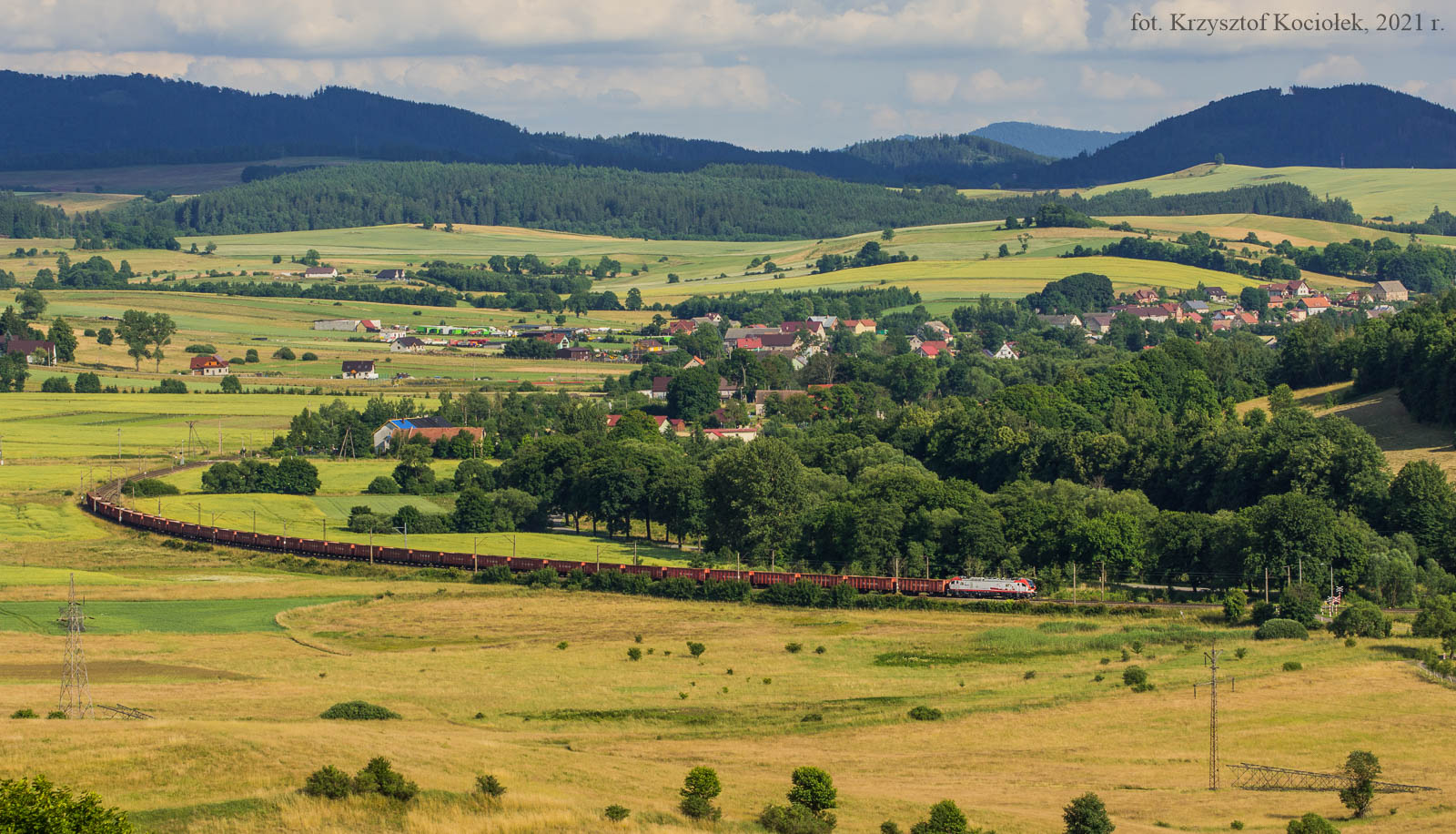 Elektrowóz 111Ed-010 z pociągiem towarowym do Sędzisławia na szlaku Boguszów Gorce Zachód - Sędzisław zbliża się do stacji docelowej. Jednakże nie był to jego ostateczny cel, gdyż po dojechaniu dzień później spalinowozu M62-1186 skład wyruszył na ostatni odcinek do Kamiennej Góry na załadunek kruszywa. Widoczne w tle fotografii zabudowania to Witków Śląski, natomiast po przekroczeniu przejazdu kolejowego, który jest widoczny po prawej stronie zdjęcia pociąg będzie już mijał zabudowania Jaczkowa. Warto także zwrócić uwagę na leżącą (nową) konstrukcję kratownicy słupa dla linii WN 110 kV, która już niedługo zastąpi wyeksploatowaną i póki co pracującą jeszcze konstrukcję wsporczą.