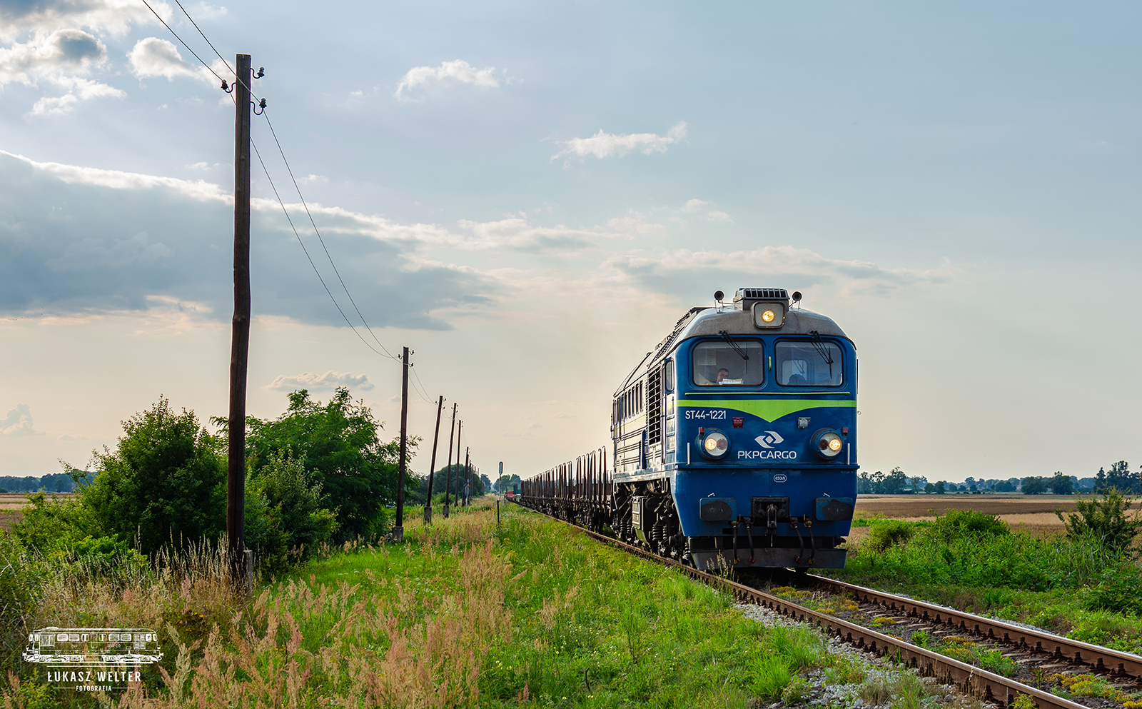 ST44-1221 ciągnie skład próżnych platform jak zwrot wagonów po pociągu wojskowym.