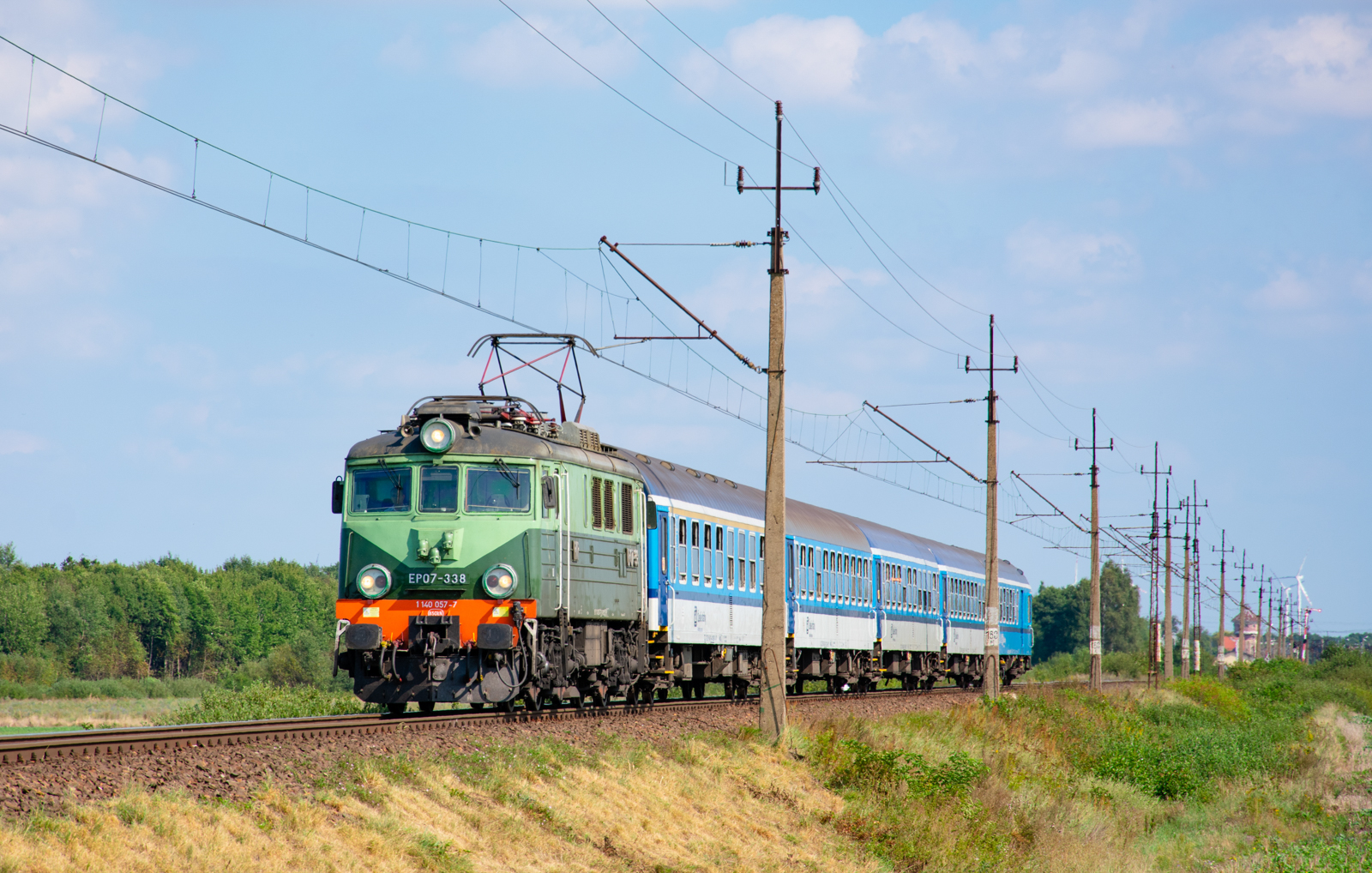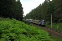 Trapez z pociągiem TLK 84157 Gwarek rel. Ustka - Katowice opuścił po krótkim postoju oraz skrzyżowaniu z pociągiem TLK 81104 Rybak rel. Szczecin Główny - Białystok prowadzonego przez EP07-362 stację w Sławnie jadąc w pogodne popołudnie szlakiem Sławno - Karwice w stronę Koszalina.