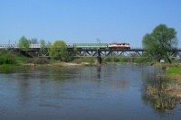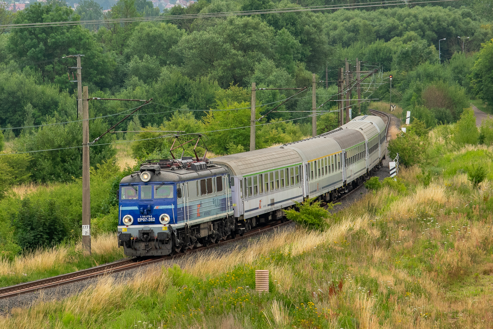 Siódemka z pociągiem TLK 80155 Koral rel. Słupsk - Ustka mija łuk za słupską stacją jadąc szlakiem Słupsk - Ustka w stronę Ustki, gdzie później przejdzie na pociąg TLK 84154 Gwarek rel. Ustka - Katowice.
