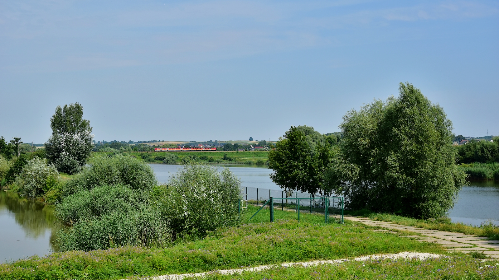 Nierozpoznany kibel jako pociąg regio R32312 z Krakowa Głównego do Ostrowca Świętokrzyskiego mija Zalewy Zesławickie w Krakowie.