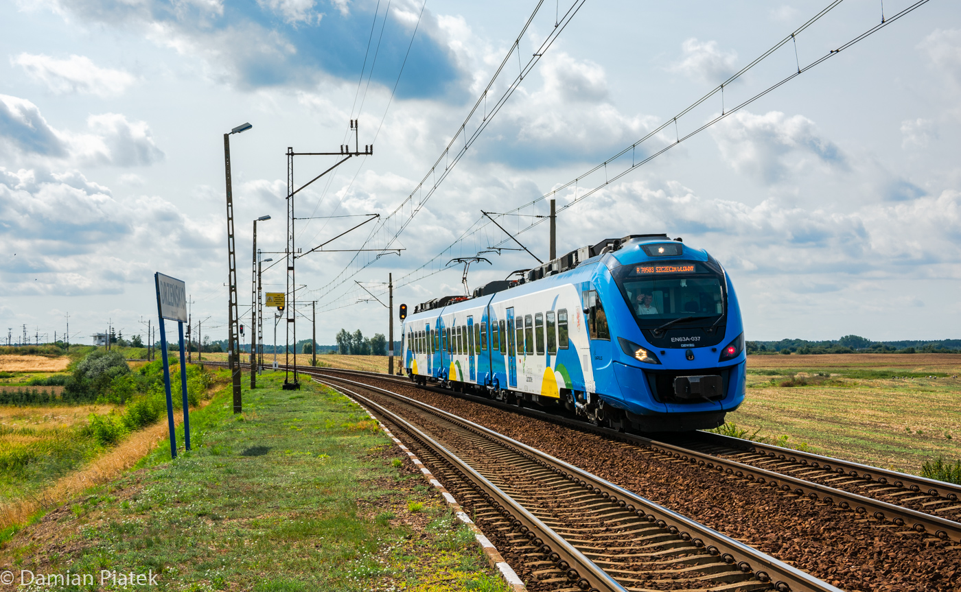 EN63A-037 jako pociąg regio 78503 relacji Zielona Góra Główna - Szczecin Główny, wjeżdża w perony przystanku osobowego w Drzeńsku.