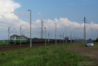 183-036 w barwach BTS ze sznurem węglarek na haku minęła stację Chełmce w kierunku Karczyna.