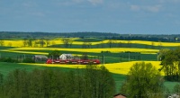Beskid Żywiecki. Pociąg Kolei Śląskich relacji Zwardoń - Zawiercie chwilę po opuszczeniu przystanku w Cięcinie. W głębokim tle góra Romanka 1366 m n.p.m.